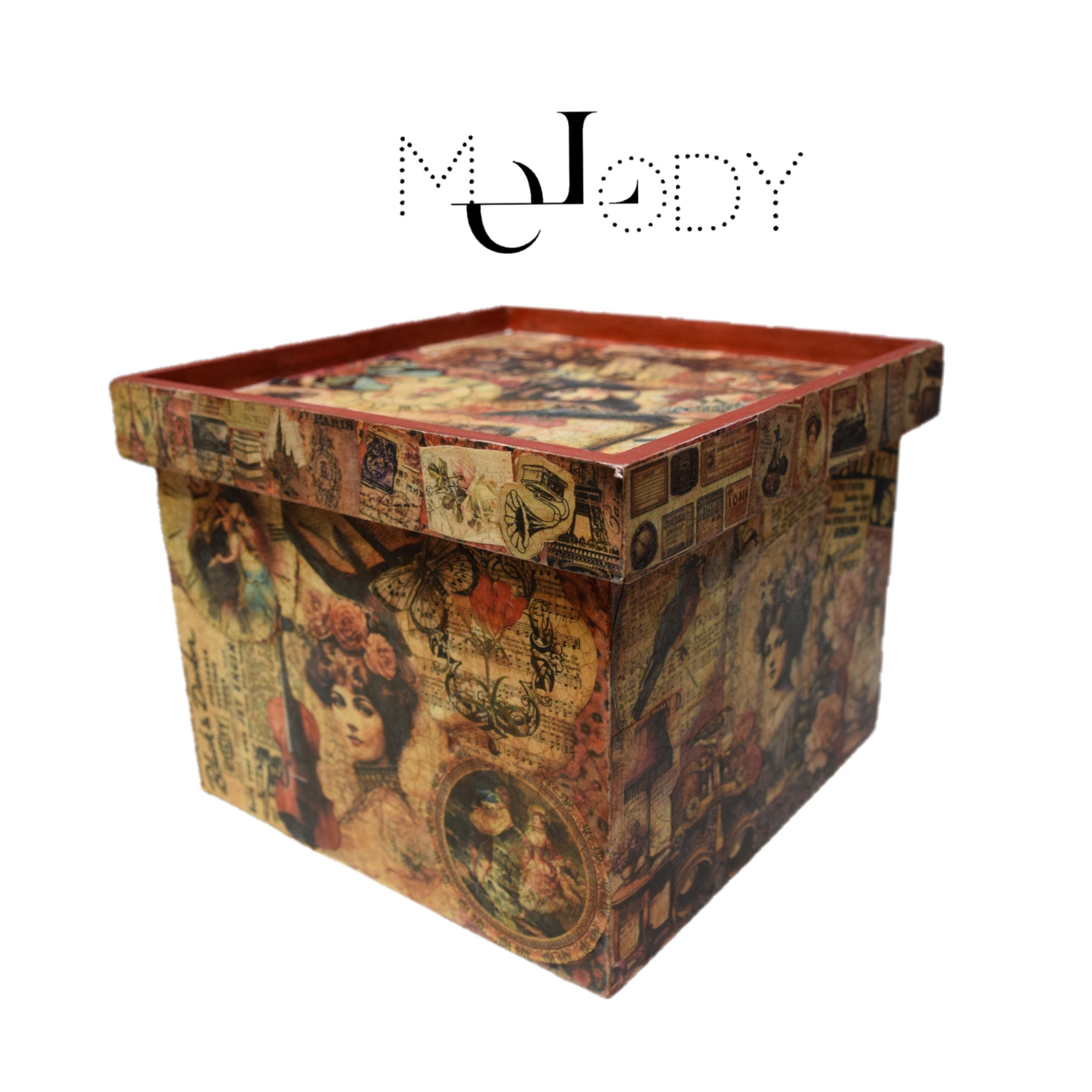 این جعبهی خاص با طرحهای کلاسیک و وینتیج، جلوهای هنری و منحصر بهفرد به دکور خانه یا محل کار شما میبخشد. سطح بیرونی آن با تکنیک دکوپاژ تزئین شده و ترکیبی از تصاویر قدیمی، گلها و نمادهای کلاسیک را به نمایش میگذارد.